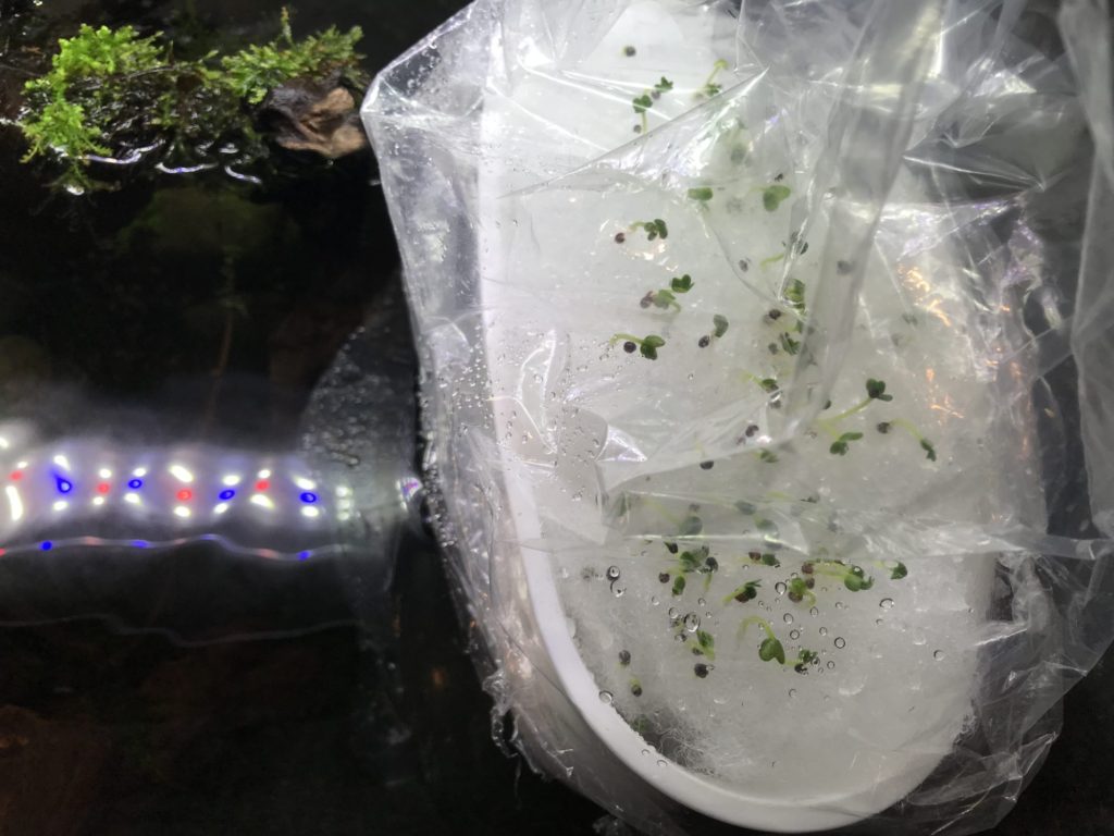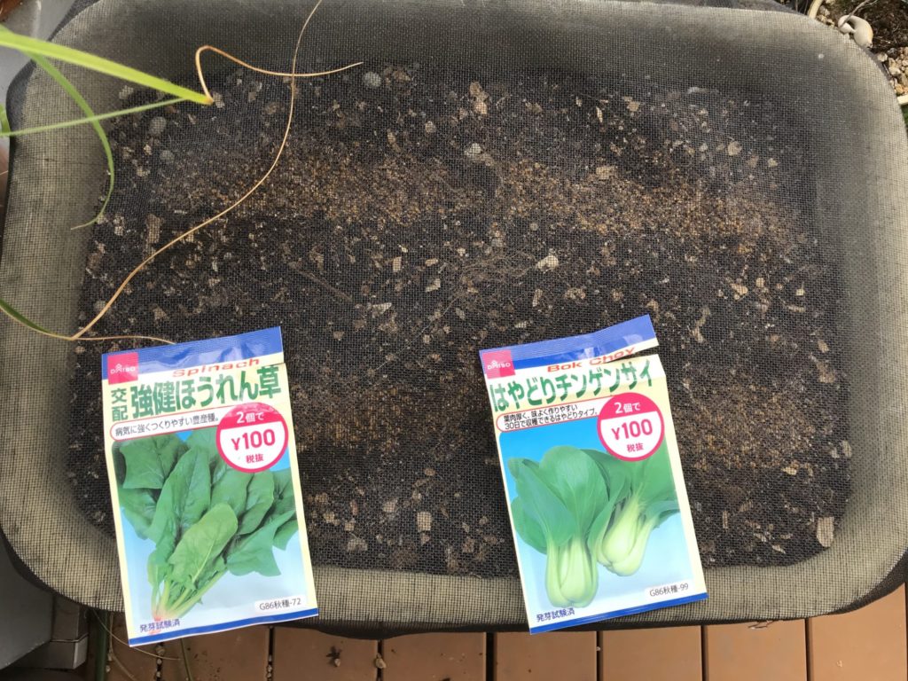 ただ水槽内に入れるだけあってある程度の景観を作れるものでなければならない。到底、大根や人参は無理だと思いダイソーで”ほうれん草”と”チンゲンサイ ”を購入。(2個で¥100)又、キッチングッズを活用しながら種まきを行なった。一応実生活でも食糧を確保したい為に、ベランダガーデニングでも植え付け。
