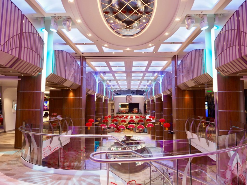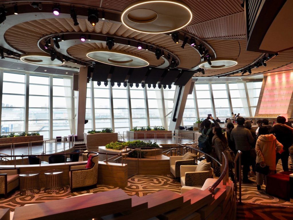 先ずは、レストラン施設があったチョップグリルやイズミを両サイドに見ながら5デッキ上からアトリウム「ロイヤル・エスプラネード」の撮影。落ち着いた色合いで構成されており飽きがこない。又、今まで見てきた各施設の色彩計画を振り返ってもカジュアルな客船に分類される割には”大人な感じ”だと思っていたら、この色彩計画は、ロイヤルカリビアングループにある「セレブリティクルーズ」の流れを組んでいるそうだ。セレブリティは、グレード的には”プレミアム”に位置しカジュアルよりワンランク上のグレードだ。