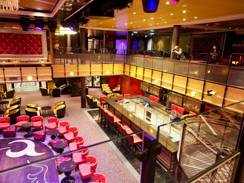 そしていよいよ最後に紹介するのは、5、6デッキ後部(船尾)にあるリラクゼーションルーム「トゥセブンティ」。最後尾に配置されているだけあって壁面ガラス越しから見える航跡を眺めるのは船旅ならではというもの。開放感十分で居心地良さそうだ。音響装置の数も驚くくらいあり、かなりの演出効果が期待できる。