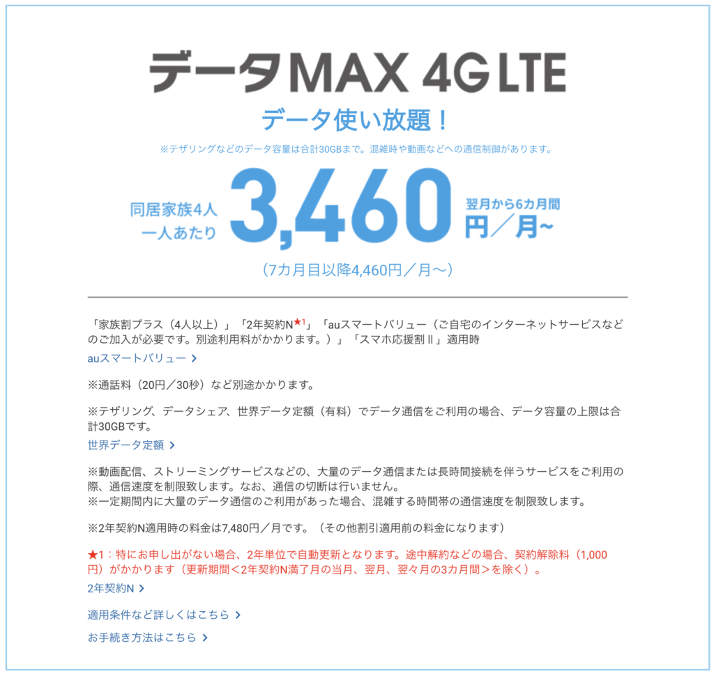 先ず「データMAX 4G LTE」だが、触れ込みは”データ使い放題3,460円”とあるが小さく横に”同居家族4人で1人あたり”がミソ。中高年で同居4人は、あまりいない。依って以後も夫婦2人を条件にする。