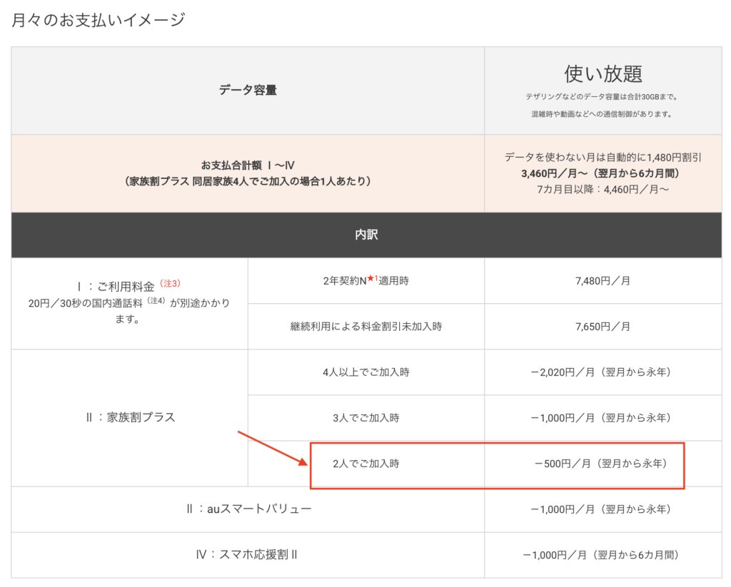 トップの1480円に目を奪われがちだが、同居2人の場合1人目はあくまでも1980円。しかし2人目は、1480円となる。更にデータ容量はauの最安プランの”3倍”の3GB!迂闊に超えることは先ずない。そして、このデータを当月使わなかった場合、最高3ヶ月先まで繰り越し出来る!翌月更新で更に伸びる。auには、この繰越が無い(昔はあった様だが・・・)依って使わなかったらドンドン貯まる。貯まった分は外出時Wi-Fiが無い場所で有効活用出来る。