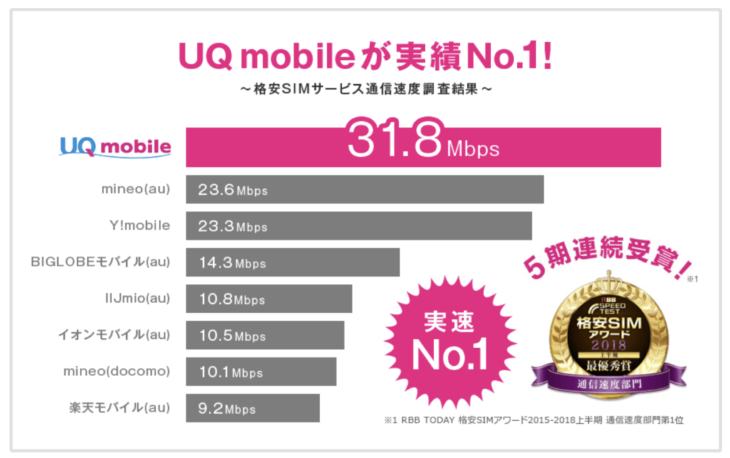 上記の通り通信速度は、”5期連続No.1”だ!今まで大手を使っていたが、全然違和感は無い。他の格安ケータイなど鼻から敵では無い様だ。