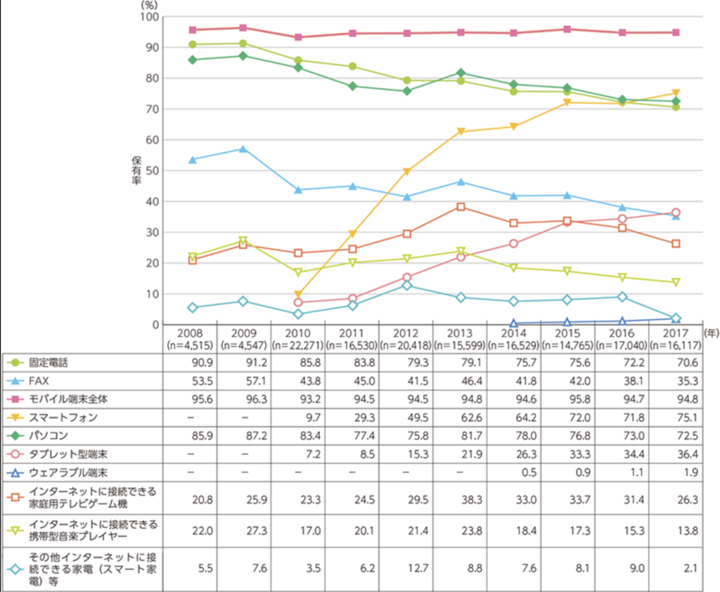 現代社会において携帯電話が普及して30年くらいは経つだろう。1億人総活躍のフレーズでは無いが国民の8割強は携帯電話を持っているそうだ。(総務省「通信利用動向調査」調べ)下の表でも解る様に10年前に10%のシェアしかなかった”スマートフォン”がこの10年で一気にシェアを押し上げた形だ。その普及していく中で常にネックになるのが”料金の高さ”だった。特に中高年世代にとっては子供の頃には固定電話しかなく、電話料金も4人1家族でせいぜい「1ケ月1万円」の電話料金だったものが、携帯電話が不急してからというもの「1人1万円」と言う生活費を圧迫しかねない料金体制になっていた。