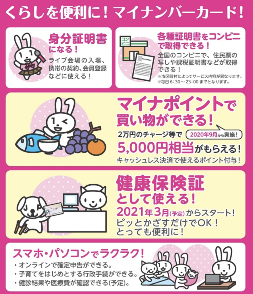 上記のことを考えると、オンライン申請が可能であった「マイナンバーカード 」を持っていた事が大きい。実際、今回の新型ウイルスを契機にカードへ切り替え申請する人で溢れ、更に混乱を招いた事は事実だ。また2020年5月下旬をもって、”紙の通知カード”は発行されなくなる為、カードへは不可避だ。通常申請してからカードを取得出来るまでに約1ヶ月掛かるが、現在自治体が混乱している為、申請しても2ヶ月は要するものと考える。依って早目に申請した方が今後の対策の為にも良い。