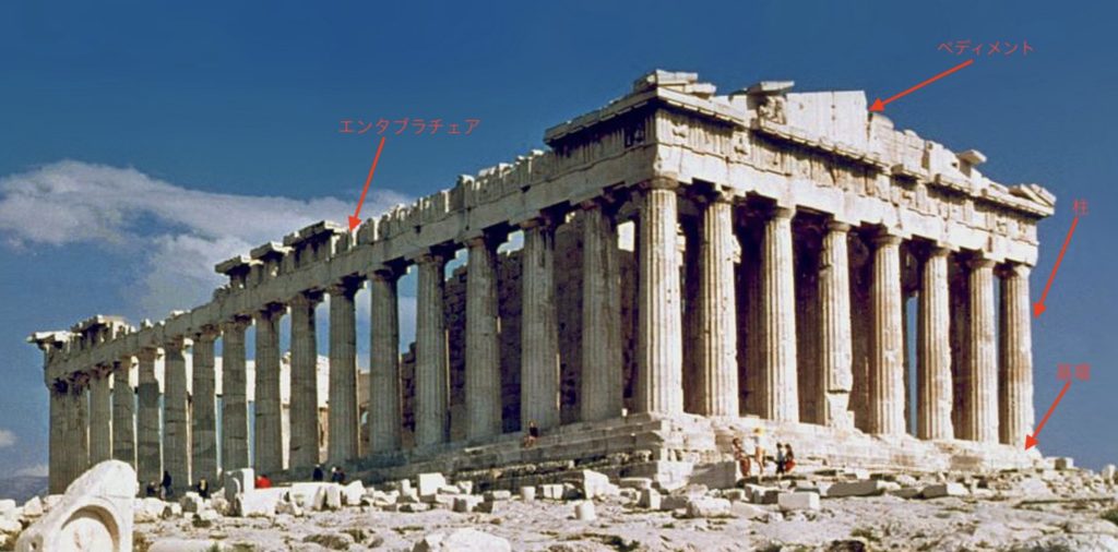 建造物の構成としては、「基壇」、「柱」、「エンタブラチェア」、「ペディメント」となっている。
