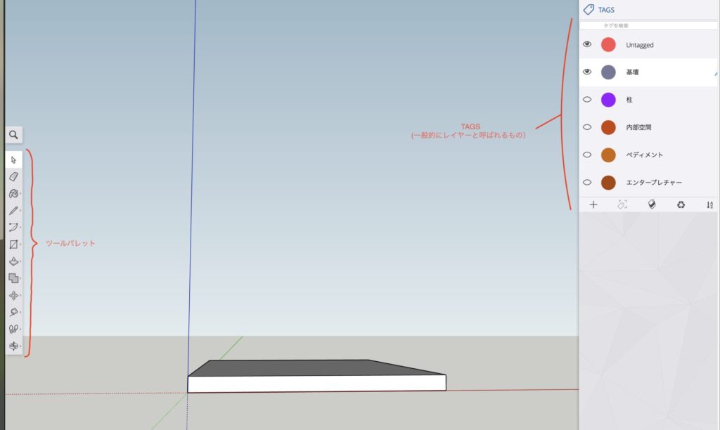 まずはレイヤー設定。Sketch Upでは「TAGS」と呼ばれる。各項目のTAGを作成し、その後ベースの「基壇」から作図開始。