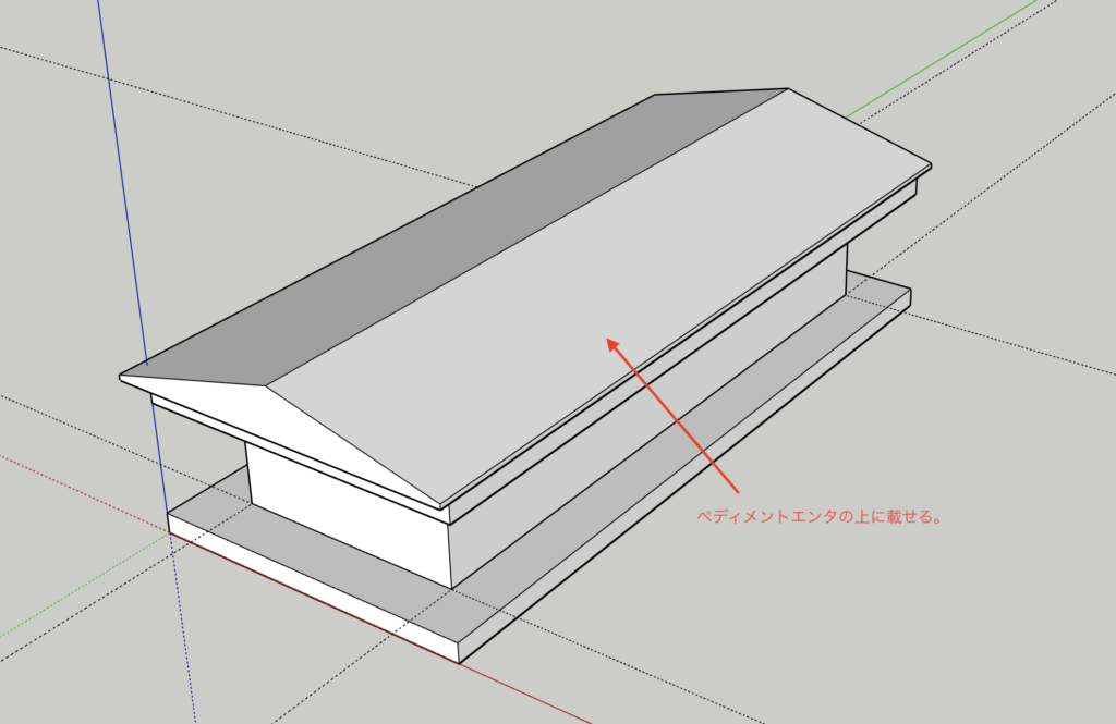 屋根になる「ペディメント」は切妻屋根となっているので、三角形を作図して厚み分”プッシュプル”
