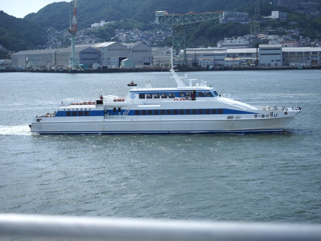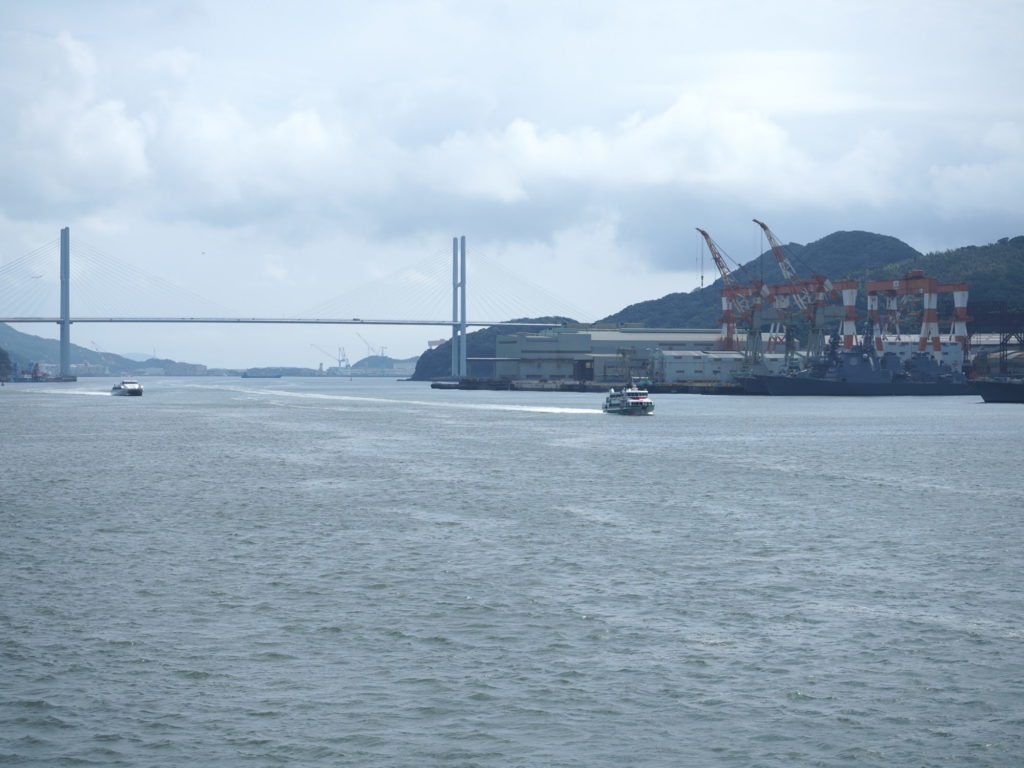 前回のPart-1に引き続き航海記を載せたいと思う。出港後、右手に三菱重工の立神ドックを見ながら突き進む。三菱はすっかり軍需工場の様相を呈していた。(ねずみ色の船が沢山)その手前を五島からの高速船とすれ違う。(手を振ったら返してくれた!俺ではないかも知れないが・・・)その後すぐ長崎港のシンボル女神大橋(通称:ビーナスウイング)をくぐる。この体験は長崎市内に住んでいる住民でもなかなか味わえない爽快感がある。