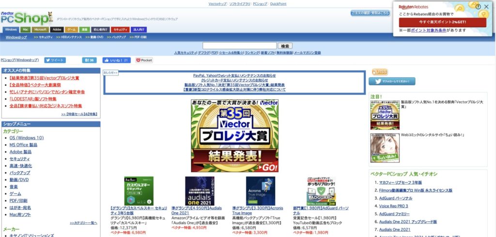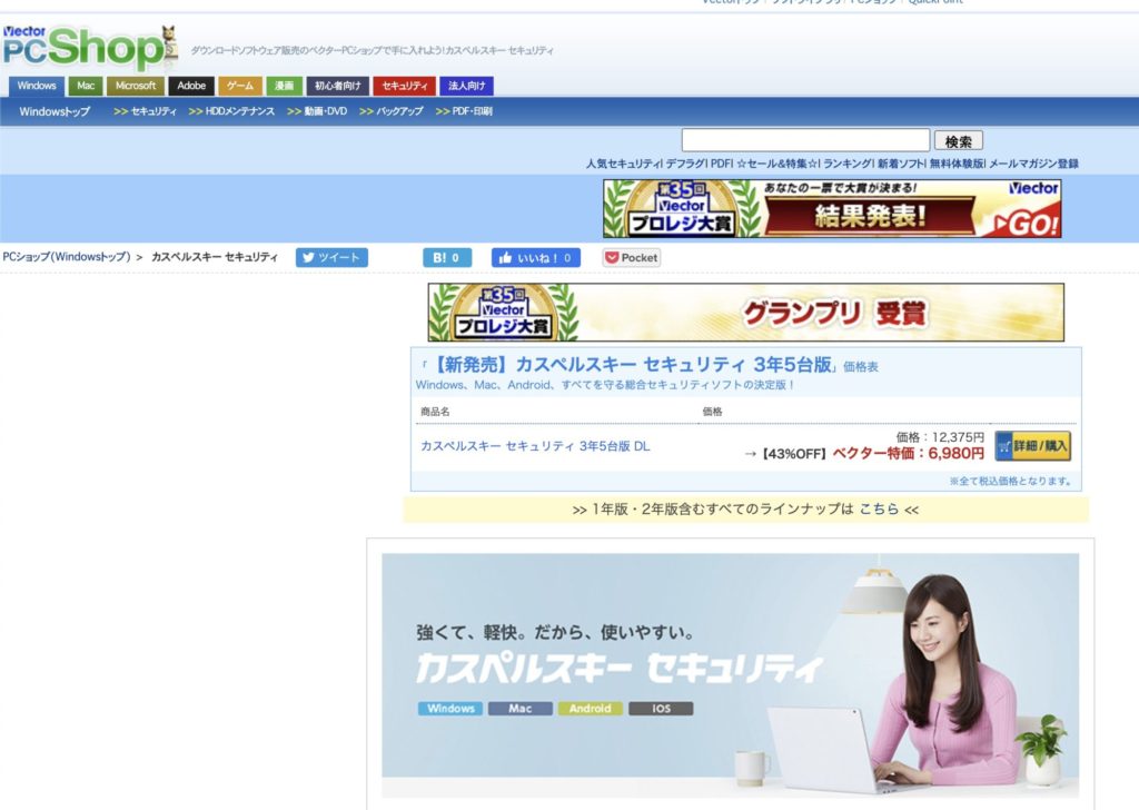 いくつか気になるソフトがあったが、調べていくとソフトのネット販売をしている「vector(ベクター)」経由で購入すると運良く期間限定であれば格安購入出来る情報を得た。早速vectorのホームページを覗いてみると、真っ先に「カスペルスキー」の文字が。うーんノートンやマカフィー、ウイルスバスターは有名だが何かロシアっぽいなと思いつつ価格も3年で5台までインストール出来、定価¥12,375から43%OFFの¥6,980で売られていた。(因みに楽天を使っている方は上記画像右上にある様に楽天リベーツ経由で購入すると楽天ポイントが付与される。)