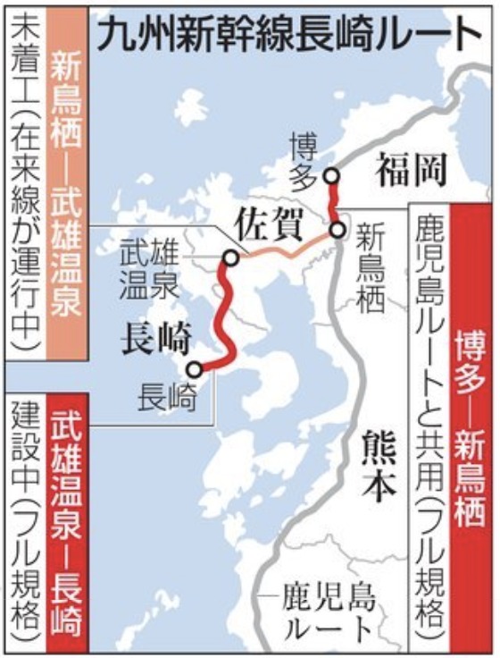 当初の計画では、長崎新幹線は「スーパー特急方式」で進んでいたが、政治的な絡みから長崎〜武雄間がフル規格にて進む事となった。その後 異なるレール幅を走れるFGT(フリーゲージトレイン)の導入が決定したが技術が確立しておらず結局東海道や山陽と同じくフル規格に落ち着きつつあった。しかし長崎〜博多間にあるSAGA(佐賀)知事が「そもそもフル規格など聞いていない!」など言い出した事で計画が頓挫してしまった。さてまたしても摩訶不思議だ。そもそも当初の計画から半世紀も経ってやっと実限目の前にして何でこんなに揉めてるのか?